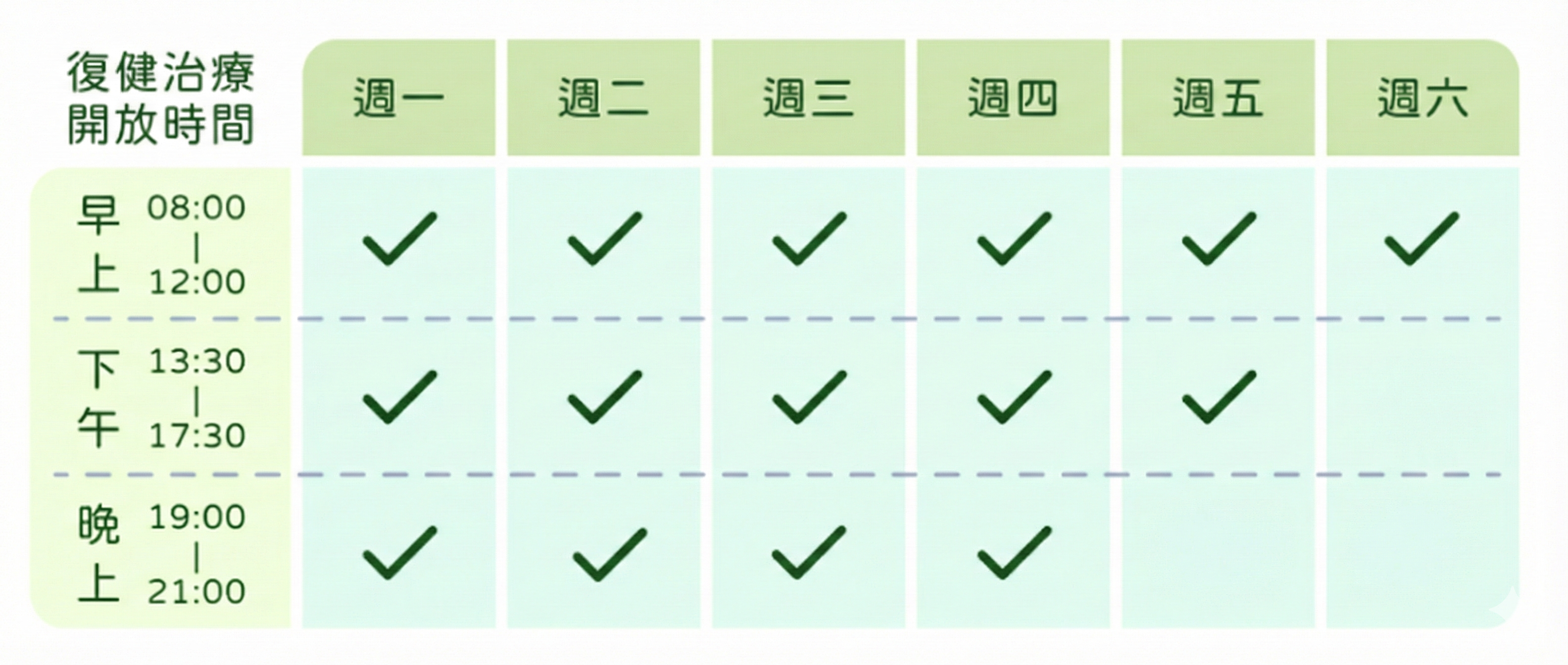 骨骼肌肉神經病變、腰酸背痛、關節疼痛、運動傷害、中風、脊椎損傷、腦性麻痺、外傷導致的功能或活動障礙之肢體復健。